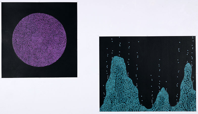 This project began with an assignment from a drawing class: make an ink drawing that is as detailed as possible. Taking this far too seriously, I was inspired to create “Origin”, the featured piece in the exhibition. The creation of this piece urged me to refine my absent-minded doodling into a concrete style of drawing. Since “Origin” was created, in the fall of 2017, this style has developed immensely. As one of the most prominent features of the works was their detail, it seemed fitting to push that detail further by having it obsessively repeat. I find this to be an effective way of portraying the forms.