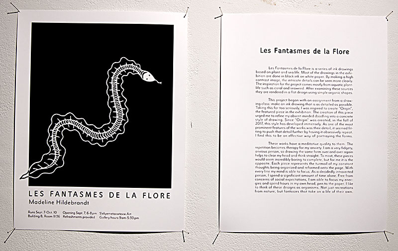 Les Fantasmes de la Flore is a series of ink drawings based on plant and sea life. Most of the drawings in the exhibition are done in black ink on white paper. By making a high contrast image, the intricate details can be seen more clearly. The inspiration for the project comes mostly from aquatic plant-life such as coral and seaweed. After examining these sources they are rendered in a flat design using simple organic shapes.