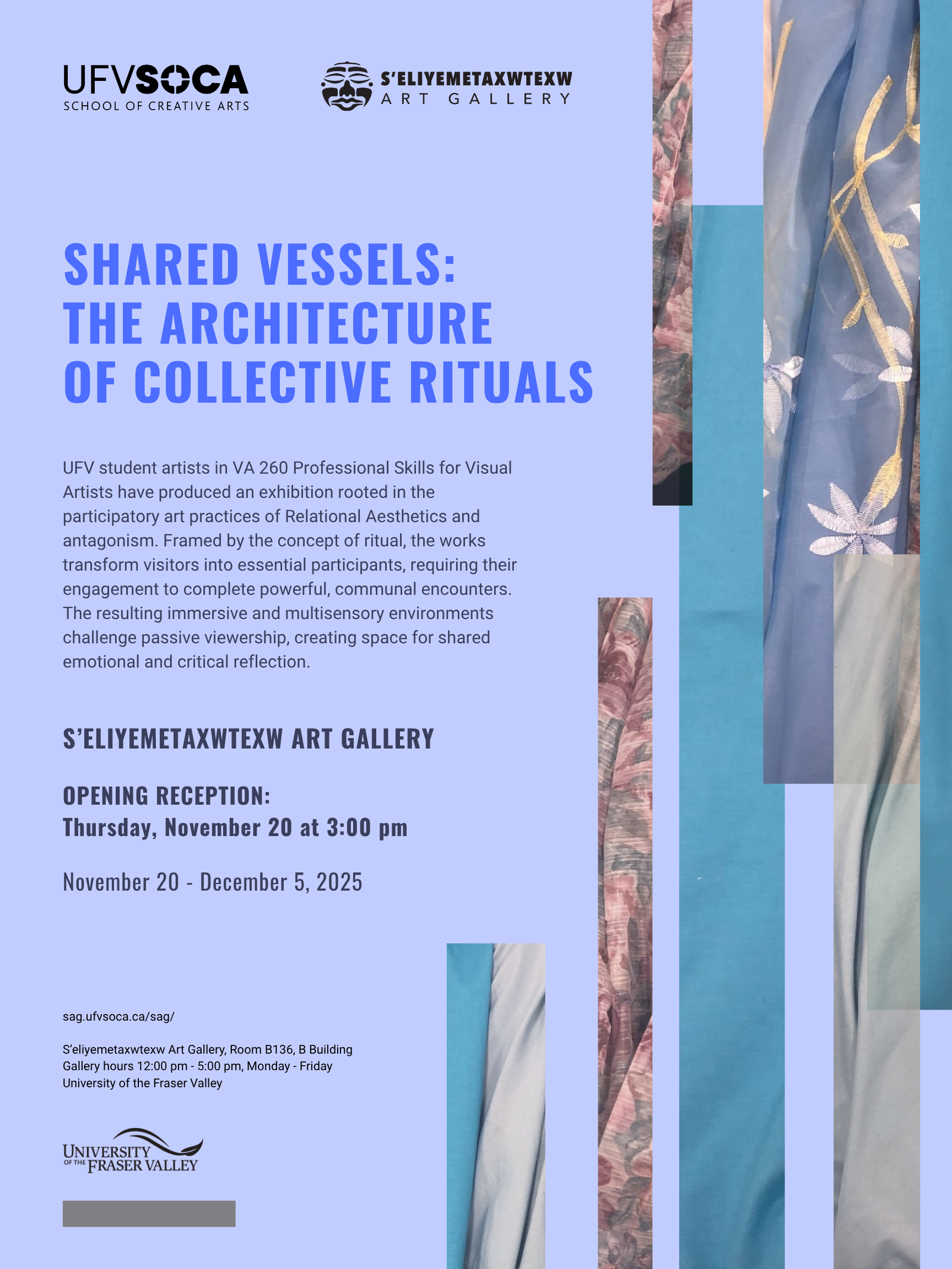 The University of the Fraser Valley’s School of Creative Arts (SoCA) is proud to present Shared Vessels. Based in the critical frameworks of Nicolas Bourriaud’s “Relational Aesthetics” and Claire Bishop’s subsequent critique, Shared Vessels presents work by Professional Skills for Visual Artists students, under the guidance of Dr. Candace Couse, that transforms viewers into essential collaborators. The exhibition explores a central question: does meaningful connection arise from harmony or from friction? Moving beyond static objects, the show creates architectures for collective ritual, challenging you to complete the works through your physical and critical engagement.